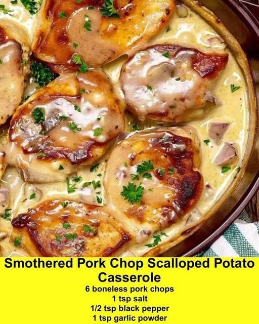 Here’s a classic, comforting recipe for Pork Chops and Scalloped Potatoes, baked together in a creamy sauce—perfect for a family dinner 🥔🥩